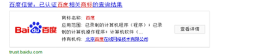 觸發(fā)機制:無論搜索任何關鍵詞,只要通過商標認證的網(wǎng)址,被檢索出現(xiàn)在百度搜索結果中,都會展現(xiàn)藍色?標。
