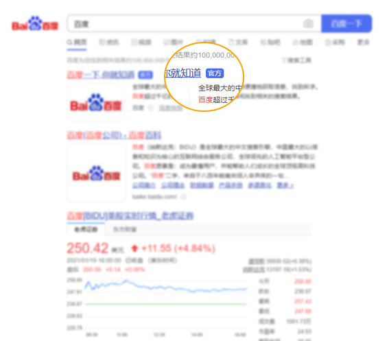 高級版觸發(fā)詞審核通過并生效后,當網(wǎng)民精確搜索該觸發(fā)詞時,若認證通過的精確網(wǎng)址出現(xiàn)在搜索結果中,將為其展現(xiàn)藍色“官方”標識。