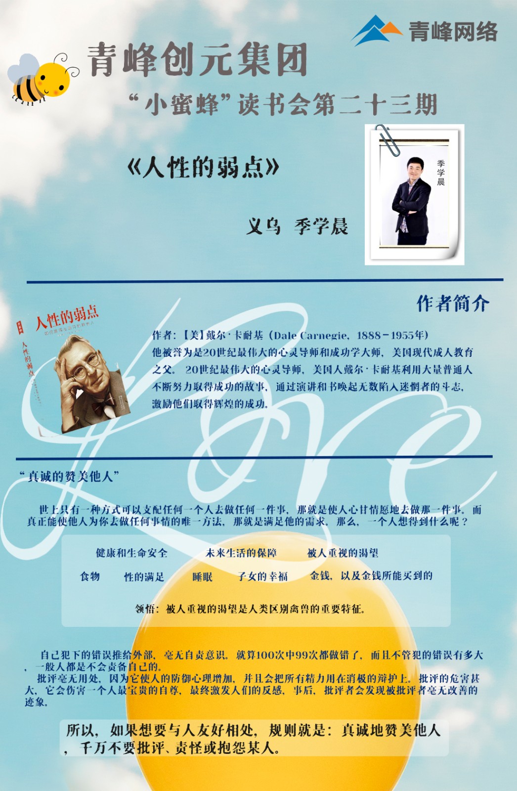 【青峰創(chuàng)元集團(tuán)】“小蜜蜂”讀書會(huì)第23期《人性的弱點(diǎn)》-- 季學(xué)晨分享