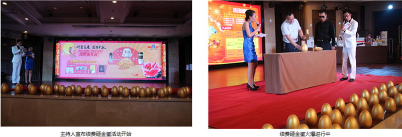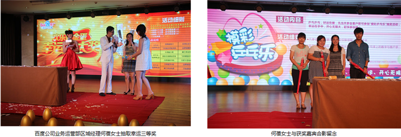 由于市場部和百度客服部的精心策劃和認(rèn)真籌備,本次答謝會在各環(huán)節(jié)上相比以往都做了創(chuàng)新和改進,“摸彩乒乓樂”活動環(huán)節(jié)抓住了客戶心理,解決了客戶中途離場的難題,客戶中途離場率創(chuàng)造歷史新低。續(xù)費砸金蛋送禮品環(huán)節(jié),更是把本次會議從一個高潮推向另一個高潮??头康耐聜儯脱鐣h(huán)節(jié)的節(jié)目也做了精心的準(zhǔn)備,使客戶在晚宴時,既嘗到了菜肴的美味,又對精彩的節(jié)目表演贊嘆不已。