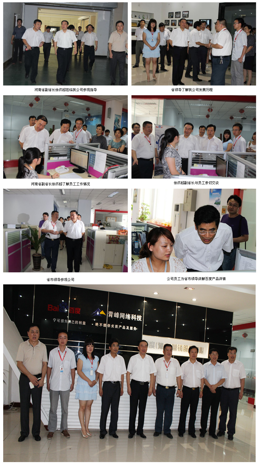 2012年7月12日,在新鄉(xiāng)市市委書記李慶貴、市長王戰(zhàn)營、高新區(qū)管委會主任王兵法、書記劉慶貴等相關領導的陪同下,河南省副省長徐濟超帶隊的省企業(yè)參觀團一行,蒞臨新鄉(xiāng)市青峰網絡科技有限公司參觀指導,徐濟超副省長詳細詢問了我公司發(fā)展歷程,企業(yè)規(guī)模等情況,與公司員工親切交談,并提出省市各級政府今后工作中將“突出企業(yè),企業(yè)為先”幫助企業(yè)不斷發(fā)展,對青峰網絡科技有限公司的發(fā)展、進步表示贊許與鼓勵。