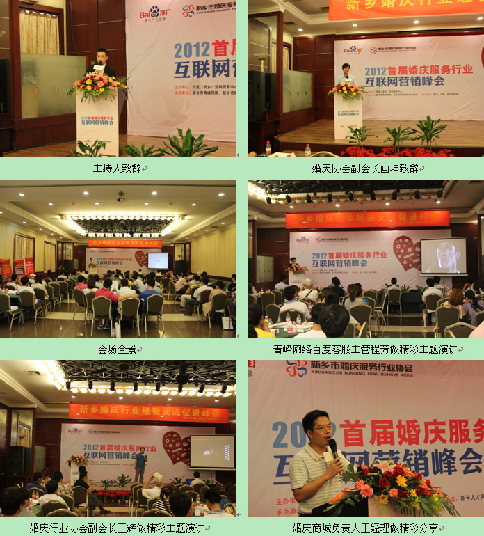 6月26日,2012首屆婚慶服務(wù)行業(yè)互聯(lián)網(wǎng)營銷峰會在新鄉(xiāng)賓館三樓召開,本次峰會由百度新鄉(xiāng)地區(qū)營銷服務(wù)中心主辦,由新鄉(xiāng)市青峰網(wǎng)絡(luò)科技有限公司、新鄉(xiāng)市婚慶服務(wù)行業(yè)協(xié)會承辦,由新鄉(xiāng)人才網(wǎng)、新鄉(xiāng)婚嫁網(wǎng)協(xié)辦。