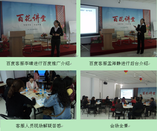 2012年4月19日,在青峰網(wǎng)絡(luò)的“百花講堂”會(huì)議室,百度客服新單組的姑娘們?cè)谶@里舉行了一次咨詢(xún)?nèi)栈顒?dòng)。本次活動(dòng)主要目的,使新加入百度推廣的客戶(hù),盡快了解百度推廣的原理和使用方法,由百度客服李晴與孟海靜主講。