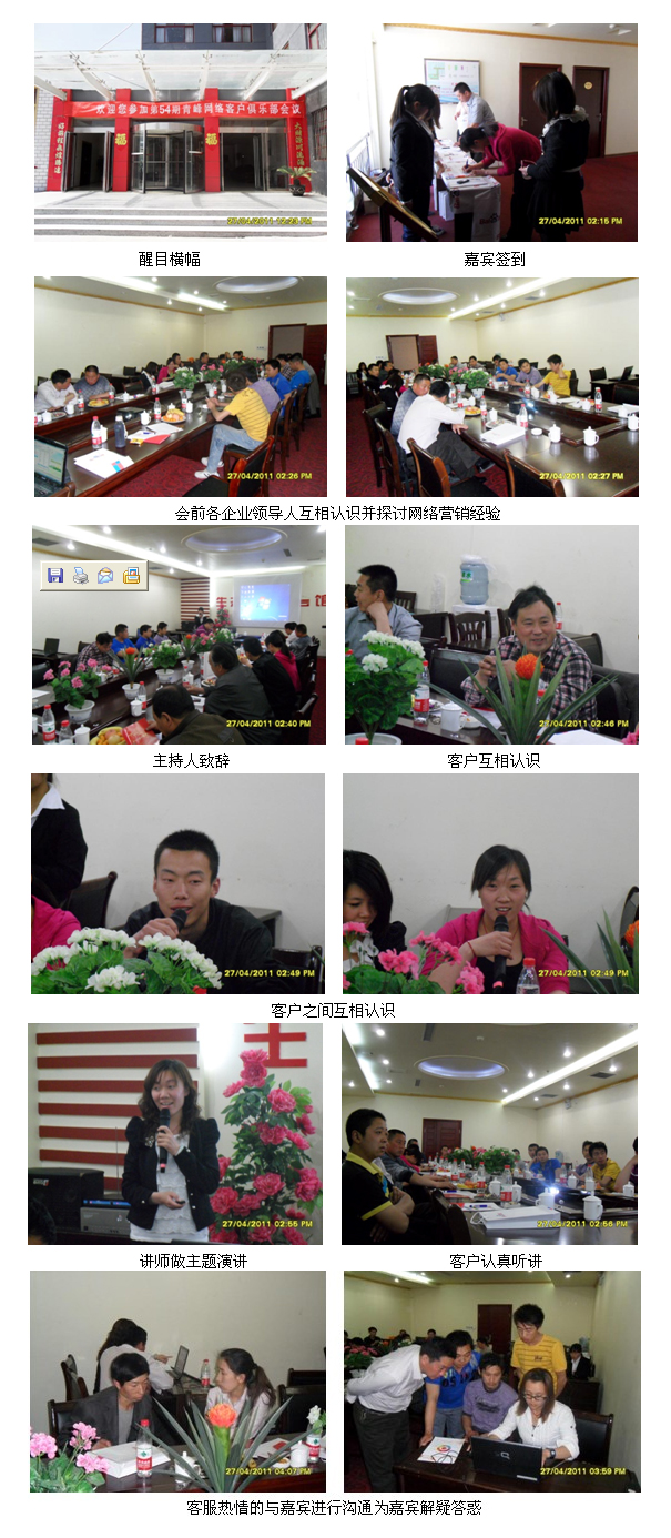 2011年4月27日,青峰網(wǎng)絡(luò)第54期客戶俱樂(lè)部活動(dòng),在安陽(yáng)市滑縣溫泉會(huì)館如期舉行。下午一點(diǎn)三十分左右,嘉賓陸續(xù)前來(lái)簽到。會(huì)前,各企業(yè)領(lǐng)導(dǎo)人互相認(rèn)識(shí)并探討網(wǎng)絡(luò)營(yíng)銷經(jīng)驗(yàn)。會(huì)中,網(wǎng)站客服主講梁巍女士從網(wǎng)站基本管理知識(shí),到網(wǎng)絡(luò)營(yíng)銷與傳統(tǒng)營(yíng)銷模式的區(qū)別,使客戶充分理解自身在網(wǎng)絡(luò)營(yíng)銷過(guò)程中存在的問(wèn)題。豐富的客戶案例,更讓客戶認(rèn)識(shí)到網(wǎng)絡(luò)營(yíng)銷在公司整體營(yíng)銷策略中的重要性,真正讓互聯(lián)網(wǎng)營(yíng)銷幫企業(yè)創(chuàng)造價(jià)值。會(huì)后,客服和客戶悉心交流,幫助客戶解決了再網(wǎng)絡(luò)營(yíng)銷中遇到的實(shí)際問(wèn)題,并進(jìn)一步拉近了客服與客戶之間的關(guān)系。